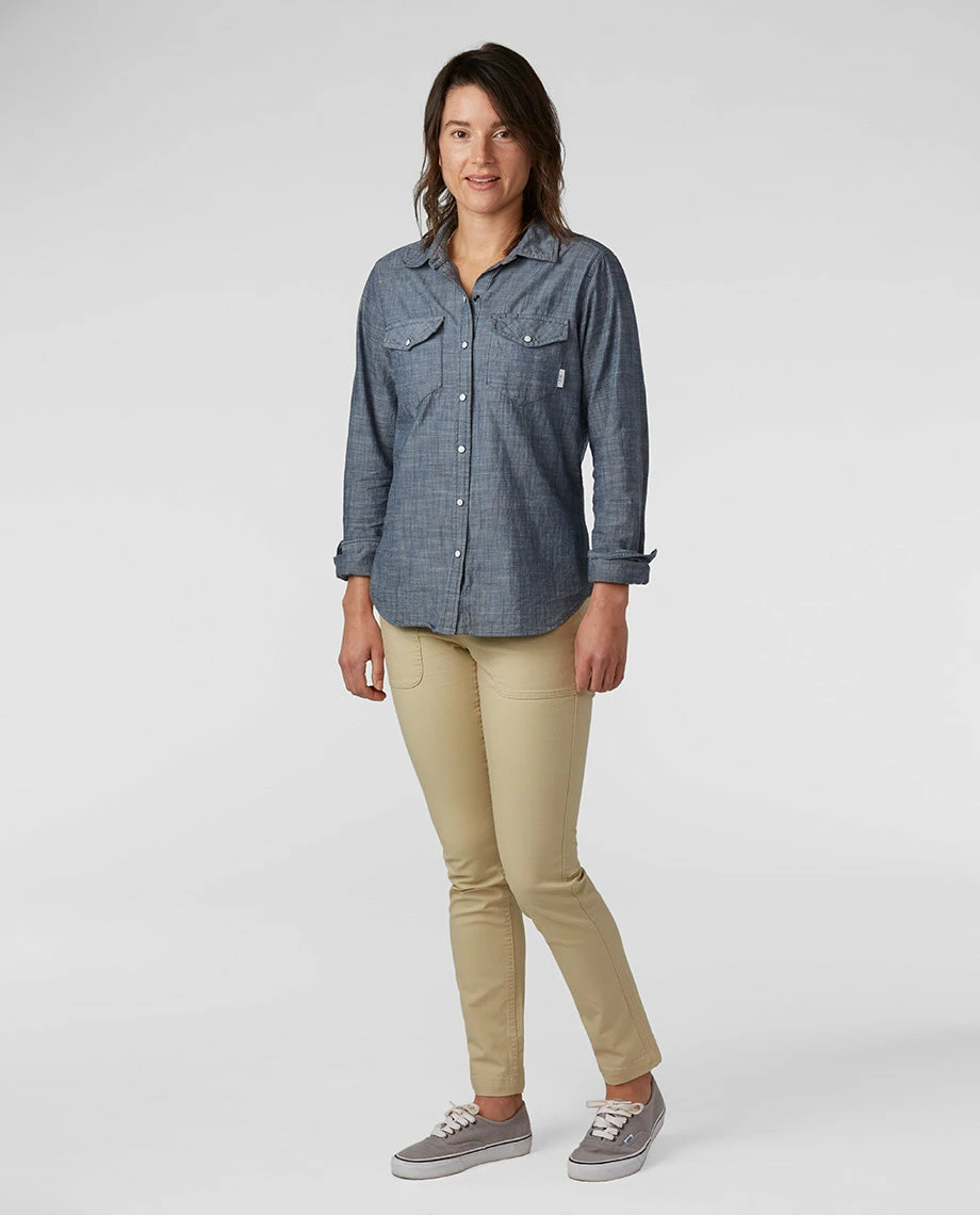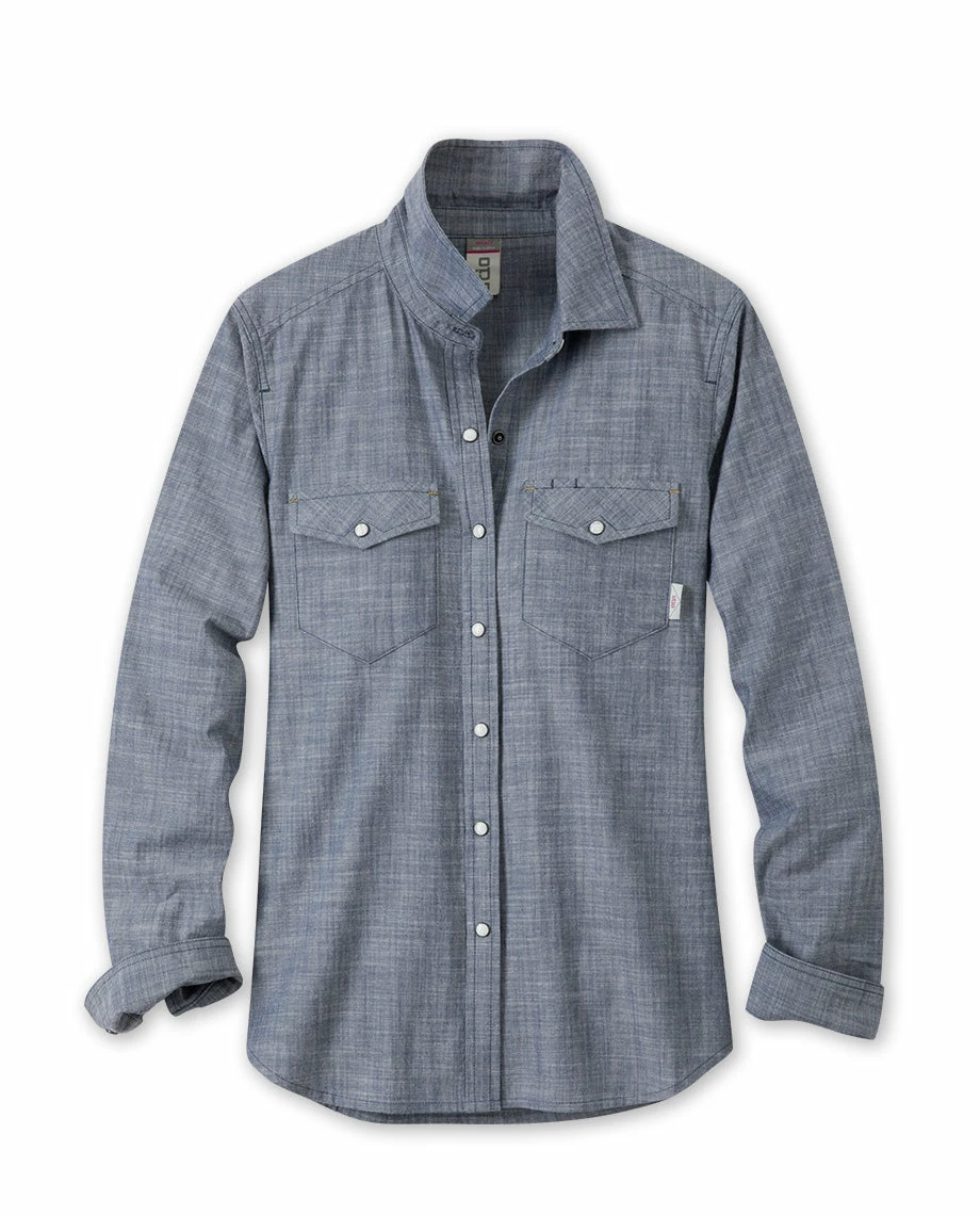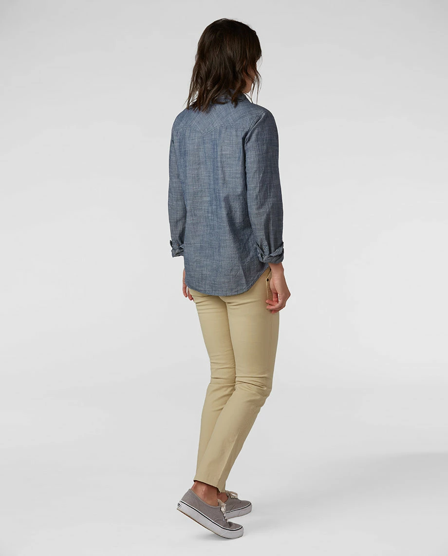 The original ethic of our hometown was founded on rugged work outside. We’ve borrowed from that lineage with our Chambray shirt, which blends the toughness inherent in the timeless woven material with a skin-side softness that stays comfortable enough for long leisurely days. Pearl snaps, pinecone buttons and classic Western detailing provides that high range identity to a piece that easily spans from work to rest to play. Adjustable placketed cuffs allow for an easy roll and a shirttail hem looks good tucked in or left out.