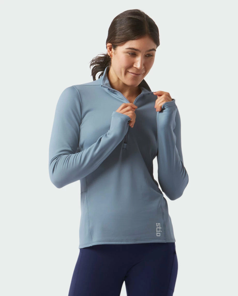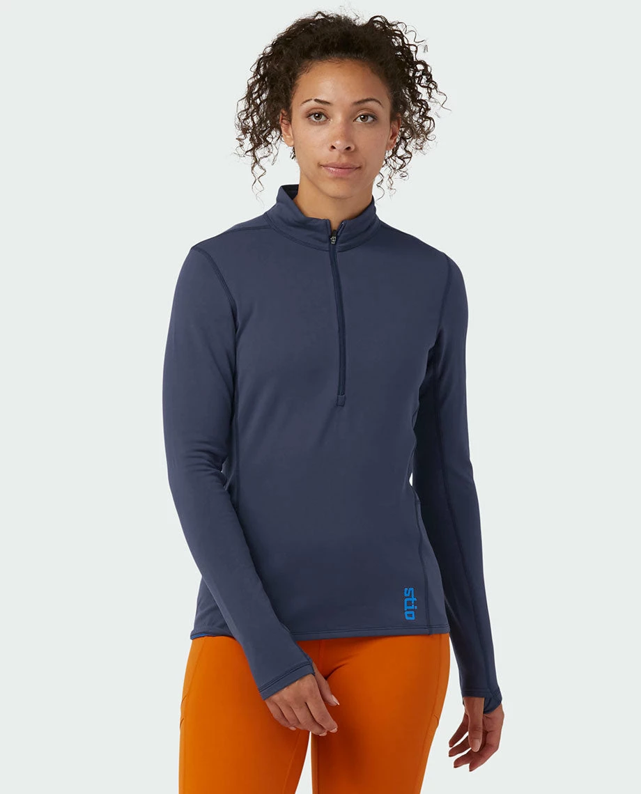 When pushing the pace during mountain workouts, our wicking, breathable and high-stretch half zip maintains comfort mile after grinding mile. Built with premium Karuishi® Stretch Fleece, the self-regulating material features integrated four-way stretch and a circular knit construction that creates both a smooth, resilient surface and a warm, fleecy interior. Integrated thumbholes keep arms down during reaching or stretching, while an inner security pocket stashes a key or a card when hitting the trail.