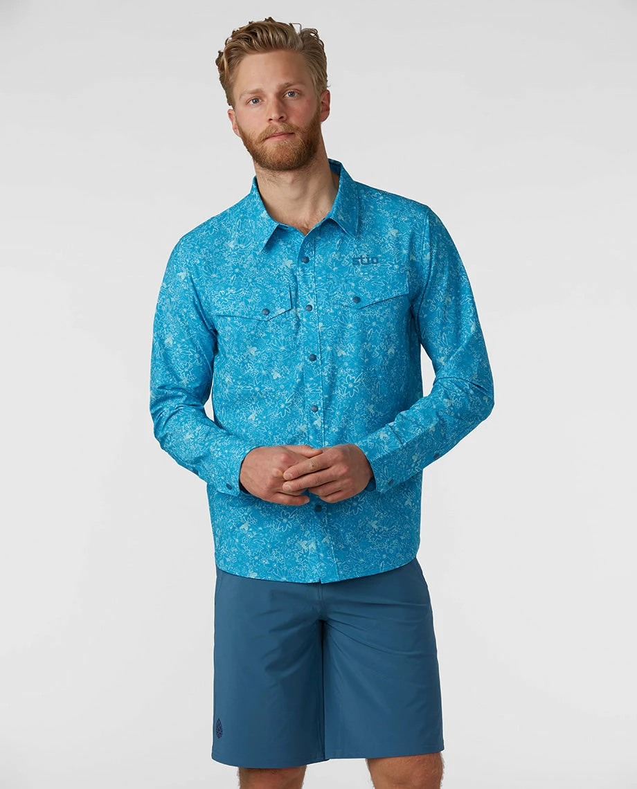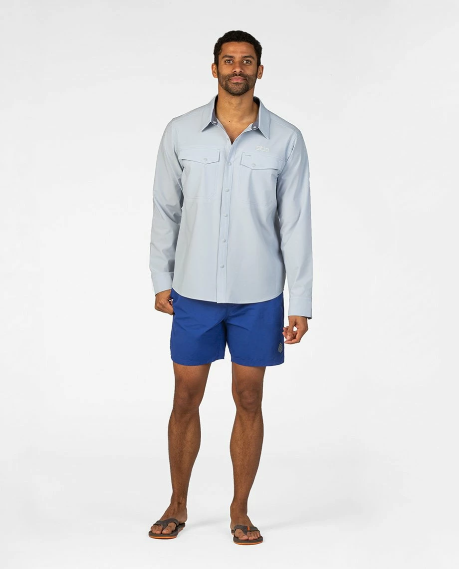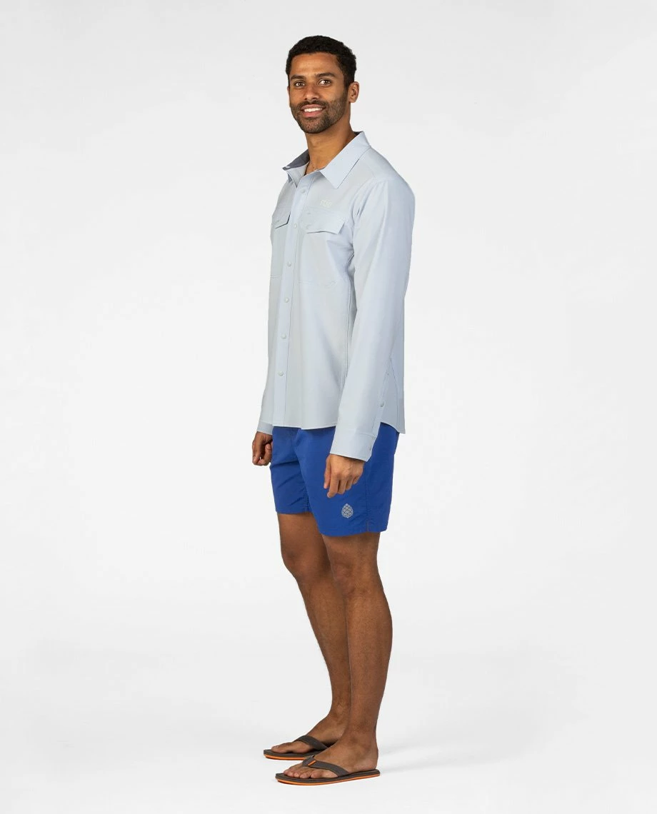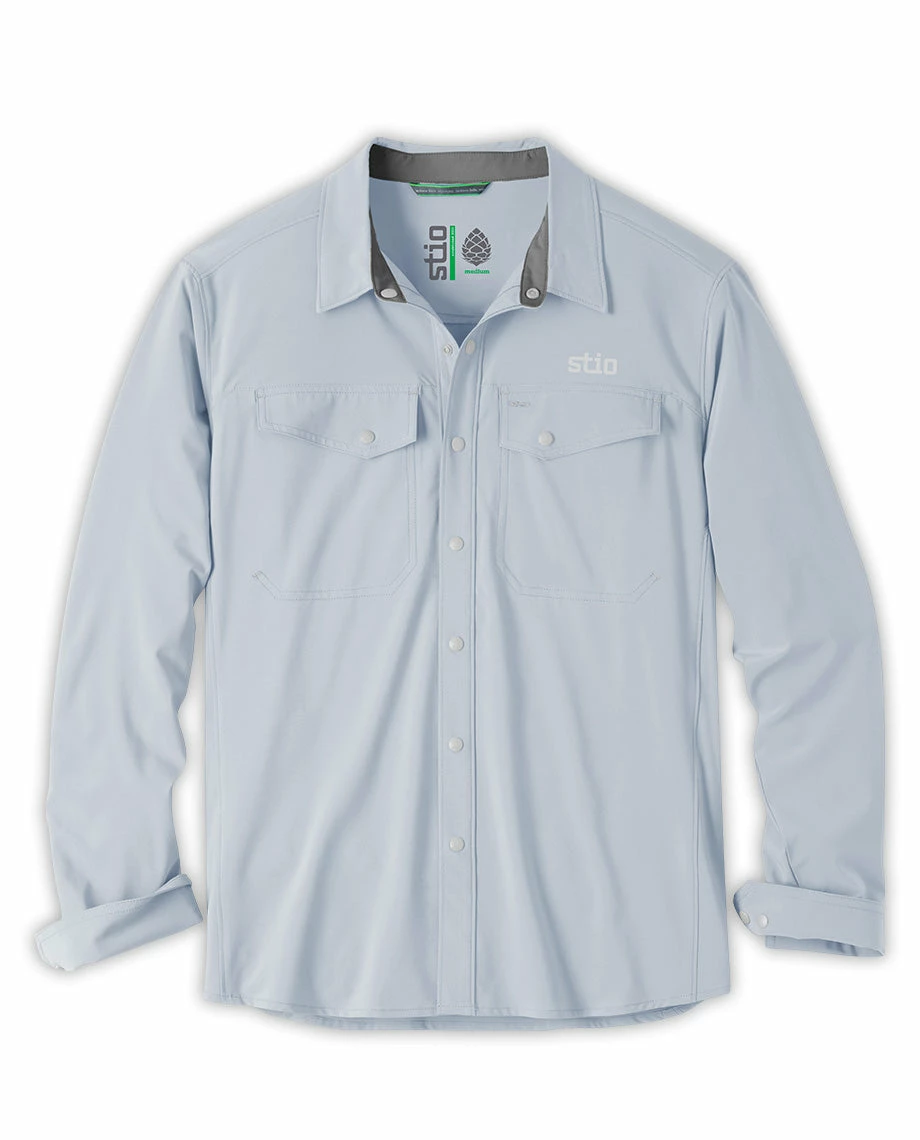 Standard uniform for river guides, boaters and fishermen from the Snake to the Salmon, the CFS Shirt provides four-way stretch and UPF 50+ sun protection with the style of a classic collared button-up. Made with Spheroโข HO stretch poplin polyester, the CFS dries quickly and moves with you as you cast, row or paddle. An oversized sun collar increases protection on bright summer days, contrast bar tacks reinforce critical seams and an oversized buttonhole at the chest pocket lets you hang your sunglasses or run a headphone cord. Two snap chest pockets stash tippet, a small fly-box or other river essentials.