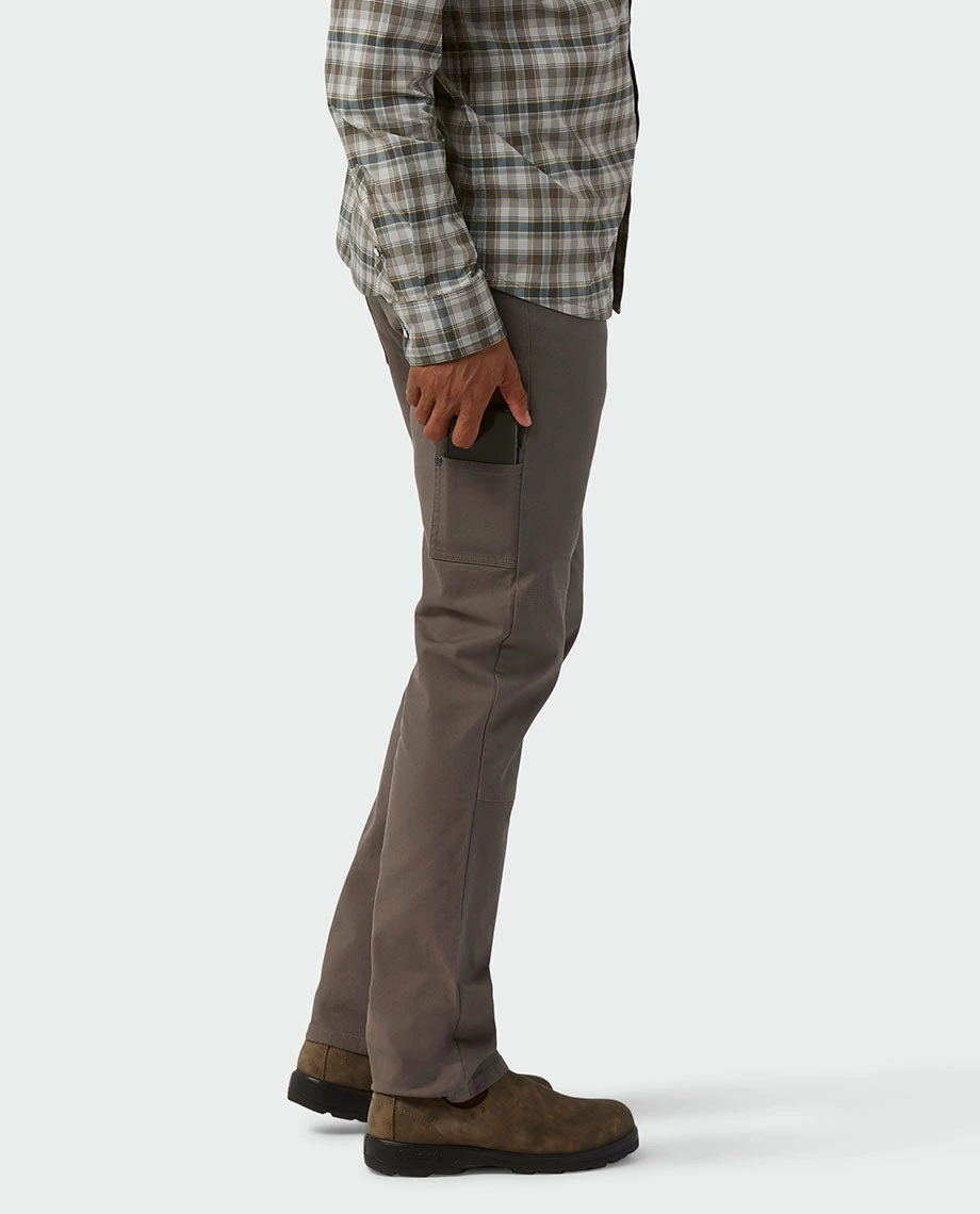 When toughness is a mandatoryโat the ranch, on the road or just tending the back fortyโour Rivet Canvas Utility Pant is up to the task at hand. The grinding, gritty, western mentality is reinforced by double-layered knees and resilient but responsible, stretch organic cotton. A classic five-pocket design also includes a back thigh utility pocket that stashes a phone or tool within easy reach. The straight leg fit adapts to in-town or off-the-grid situations while signature elements such as three peaks embroidery and custom Stioยฎ rivets identify with the local mountain landscape.
