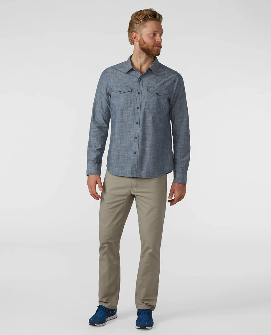 The original blue-collar fabric, chambray is interwoven with high range history due to its tough, durable character and constant use in rugged, outdoor environments. Long a work-shirt staple of the mountain west, our modern woven take adds a texture of ranch heritage with sawtooth flap-closure pockets, pearl snaps and a western back yoke. Reflecting the high range terrain we call home, the result is a comfortably textured shirt that walks that county line between bootstrap western and unrushed mountain casual.